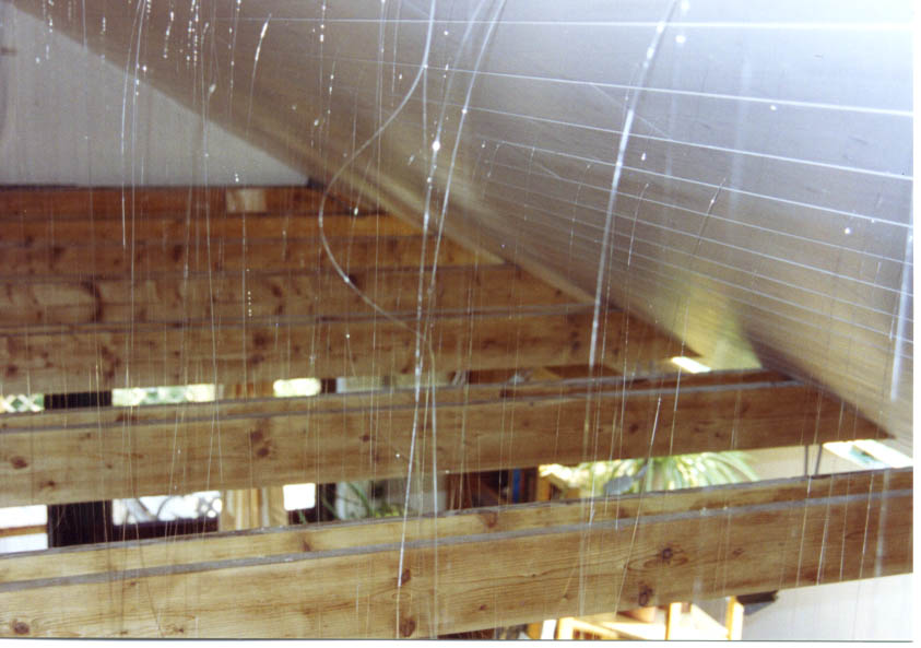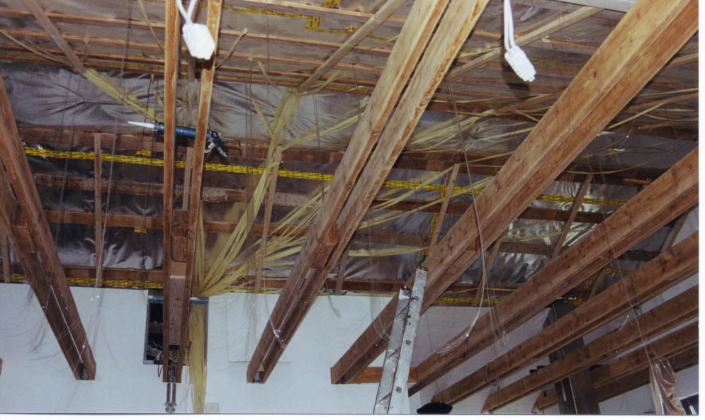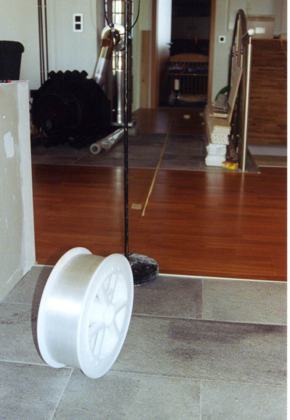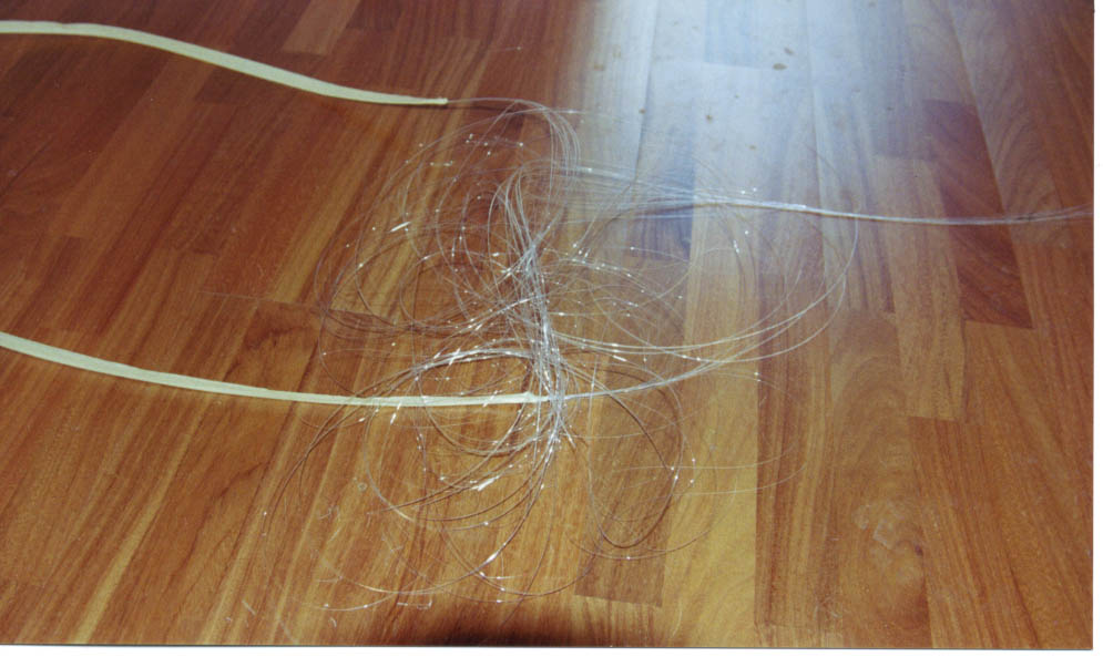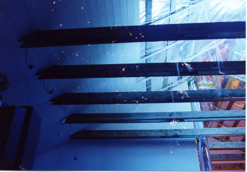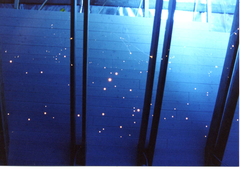 Projektierung und Montage eines realistischen Sternenhimmels aus Lichtfasern Als wir 2001 unser Domizil radikal entkernt hatten, ist durch die Zusammenlegung von Wohnzimmer, Küche und Flur ein ca. 65 Quadratmeter großer Raum entstanden, der bis in die Dachspitze reicht. Auf halber Höhe queren die Kehlbalken den Raum. Es stellte sich damals die Frage, wie man den Platz über den Balken optisch anspruchsvoll gestalten kann. Die Idee kam dann spätestens auf der Ausstellung Light&Buildung 2002: Die Holzvertäfelung der Decke sollte eine möglichst naturgetreue Nachbildung des Sternenhimmels zieren! Dabei waren folgende Parameter entscheidend: - Die Montage der Leuchtmittel sollte einfach sein - Es sollten 6 verschiedene Sterngrößen darstellbar sein - Die Sterne sollte real wirken, also auf- und untergehen können (=dimmbar sein), klein sein und möglichst leicht funkeln Nach Abwägen der Vor- und Nachteile verschiedener Systeme kam folgendes Material zum Einsatz: 1 Projektor 100W Halogen mit Farbrad und je 1 Rolle Kunststoffasern in 0,25mm und 0,75mm Durchmesser. Sämtliches Material wurde vorn der Firma GP Fiber Optics GmbH ( www.gp-fiberoptics.de ) bezogen, die die genannten Produkte zu angemessenen Preisen anbietet. Bei Lichtfaseranwendungen und insbesondere bei Sternenhimmeln ist der Unterschied zwischen Kunst und Kitsch sehr gering. Bei Muster-Sternenhimmeln diverser Hersteller fällt ein Hang zu geometrischen Formen oder zu überbetonten Galaxien" oder anderen Sternenanhäufungen auf, die einen ansonsten schönen Sternenhimmel kitschig wirken lassen. Um so etwas zu vermeiden, sollte die Position der Lichtpunkte möglichst genau mit dem Original übereinstimmen. Zur Generierung eines original Sternenhimmels diente das Programm EasySky ( www.easysky.de ), die kostenlose Demo-Version reicht für diese Zwecke vollkommen aus. Nach Angabe des Standortes kann jetzt für jeden beliebigen Zeitpunkt die Position aller Sterne dargestellt werden. Zusammen mit einer Schablone für den verfügbaren Raum für den Sternenhimmel kann man jetzt den gewünschten Himmelsausschnitt aussuchen, der einem am besten gefällt. Tipp: Es ist hilfreich für den späteren Betrachter, wenn geläufige Sternenbilder wiedergegeben werden, um die Orientierung zu erleichtern. Jetzt muss der Umfang der benötigten Kunststoffasern bestimmt werden: Hierzu fertigt man sich am besten einen Screenshot (EasySky-Vollansicht) des gewählten Ausschnittes an (mit Koordinatengitter) und druckt das Ganze als Negativ über ein beliebiges Zeichenprogramm aus. Darauf überträgt man die Umrisse des zur Verfügung stehenden Raumes (spiegelverkehrt natürlich, der Himmel soll ja an die Decke!) Anschließend nummeriert man die darzustellenden Quadranten durch und druck jeden Quadranten stark vergrößert in EasySky aus (beachte den Bug in EasySky bei der Höhenskalierung, in meiner Version gab es einen Versatz von 1° Höhe). Auf diesen Ausdrucken markiert man alle sichtbaren Sterne und notiert ihre Helligkeit (Stern anklicken). Sie ist in Magnitude [m] angegeben, je kleiner die Zahl, desto heller das Objekt (sie kann auch negativ werden für sehr helle Objekte). Je mehr Helligkeitsstufen man später nachbildet, desto realistischer wirkt es. Im vorliegenden Fall wurden Objekte bis 6m angezeigt und diese in 6 Helligkeitsstufen aufgeteilt (0-0,9m; 1-1,9m; 2-2,9m usw.). Die Anzahl der Sterne je Helligkeitsstufe wird dann für jeden Quadranten notiert und aufsummiert (Excel hilft). Als Endergebnis bekommt man die Anzahl der dargestellten Sterne; bei uns ca. 1250. Wenn der Standort für den Projektor feststeht, kann man für jeden Quadranten den Abstand zum Projektor ausmessen und mit der Anzahl der jeweiligen Sterne multiplizieren (unbedingt jeweils 2 oder mehr Meter mehr je Stern einplanen, nachträglich kürzen geht immer ). Jetzt geht es um die benötigte Faserlänge: Bei z.B. darzustellenden 6 Sternenhelligkeiten benötigt man eigentlich 6 unterschiedliche Faserdurchmesser. Oder man fasst an den Austrittsstellen mehrere Fasern zusammen, die gemeinsam einen Lichtpunkt bilden. Der korrekte Faktor für den Helligkeitsunterschied zwischen 1m und 2m beträgt 2,512. Die Faserfläche zwischen einem 1m und einem 2m-Stern sollte sich daher ebenfalls um den Faktor 2 oder besser Faktor 3 vergrößern. Im vorliegenden Fall wurden für die Sterne folgende Fasern verwendet: 0-0,9m8x0,75mm 1-1,9m4x0,75mm 2-2,9m2x0,75mm 3-3,9m1x0,75mm 4-4,9m3x0,25mm 5-6,0m1x0,25mm Der errechnete Querschnitt des Gesamtbündels an Fasern, die an den Projektor angeschlossen werden müssen, darf 30mm nicht überschreiten (abhängig vom Projektor), in unserem Fall ergab sich ein Bündel von ca. 18mm Durchmesser. Passt! Und nun zur Bohrschablone: Eine dicke durchsichtige Kunststofffolie wird ausgelegt und die Raumgeometrie übertragen. Zusätzlich wird das Quadrantennetz aufgezeichnet (10°-Schritte). Sinnvollerweise ist die Gradeinteilung auf der Folie mitschreiben. Zur genaueren Positionierung der Sterne kann man sich aus alter Tapete eine Schablone mit 1°-Einteilung machen. Anschließend werden die Sterne von den einzelnen (vergrößerten) Ausdrucken übertragen. Z.B. Kreuze in verschiedenen Farben am besten zusätzlich mit Zahlen für die verschiedenen Helligkeiten. Ist das geschehen, schneidet man die Folie in Bahnen (nummerieren!), die der Breite eines Vertäfelungsbrettes entsprechen, die spätere Bohrschablone ist fertig. Es hat sich bewährt, für jeden Quadranten ein abgezähltes Faserbündel in der benötigten Länge herzustellen. Hierzu die Fasern um 2 entfernte Stangen (Stehlampen sind bestens geeignet) wickeln und der Länge nach mit Kreppband fixieren. Anschließend kann das Bündel an den Enden aufgeschnitten werden und provisorisch an der Unterlattung befestigt werden. Es ist dringend davon abzuraten, die Fasern einzeln zu ziehen, da sie sich immer irgendwo verhaken und als verworrenes Knäuel kaum voneinander zu trennen sind!!! Das Faserbündel für den